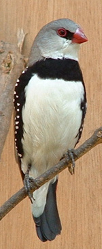 ![]() The Diamond Firetail finch is an extremely attractive Australian finch. With its highly contrasting and distinctive markings it is a visually impressive bird which also has an elegance both when perching as well as in flight. They are difficult to sex although our local stockist maintains that there is a visible difference in the shape of the eye - the male being round whilst the female is oval. Other sources say that the female has paler lores and a thinner black breast band. Ours have proved hardy though none has survived beyond 2 years and no pair has mated as far as we know. At various times we have had them nest and become very attentive to their nests for long periods but so far we have seen neither eggs nor chicks. They nest in standard finch nest boxes at the top of the aviary and then become territorial. It may be that they haven't bred because of the close attentions of zebra finches once they have settled on a box. They do not roost in shrubs or bushes, prefering either stripped branches or nest-box perches. They spend the night in a nest-box.